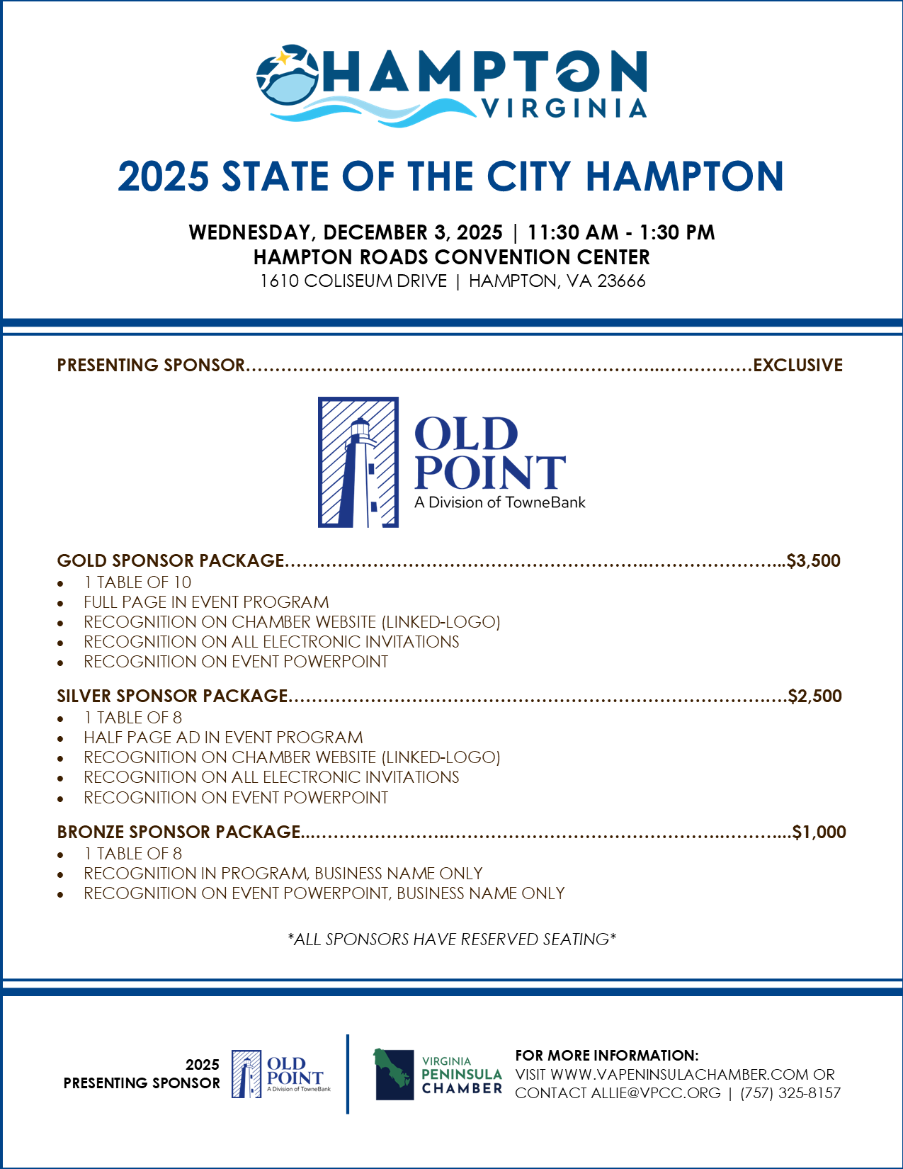 The Virginia Peninsula Chamber presents a forum for local Mayors to report on the State of their city. The speeches themselves are as unique as the individuals that give them. The common thread, however, is that each one shares a message from the city to the Chamber members. The State of the City event will provide a venue to celebrate with city stakeholders, citizens and business alike, the accomplishments that have been achieved and those planned for years to come.